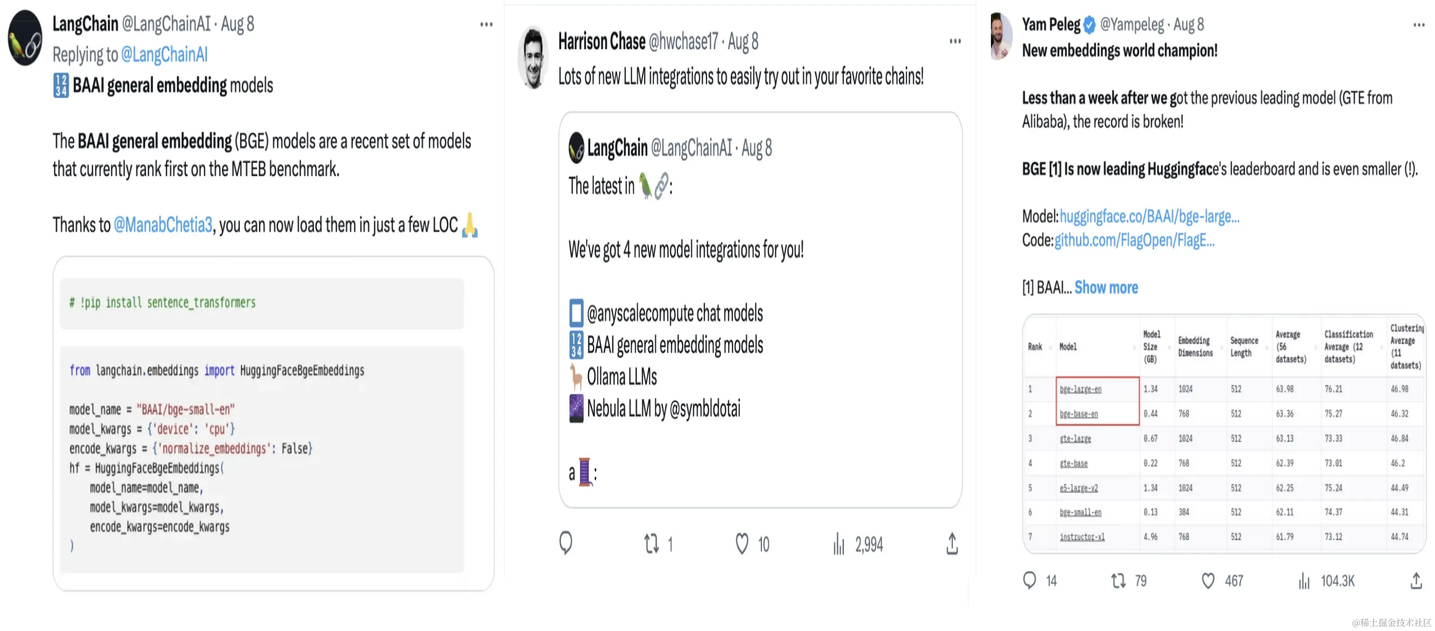 Langchain官方、LangChain联合创始人兼首席执行官Harrison Chase、Deep trading 创始人Yam Peleg等社区大V对BGE表示关注。