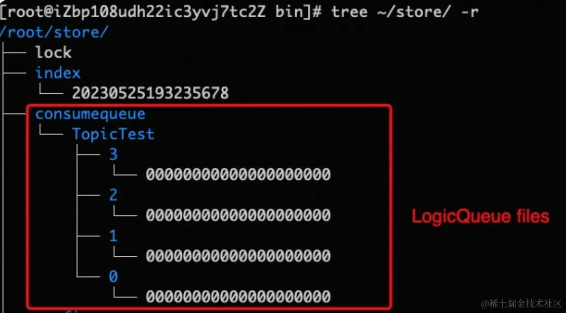 RocketMQ在消息存储的时候将消息顺序写入CommitLog文件,如果想根据Topic对消息进行查找,需要扫描所有CommitLog文件,这种方式性能低下,所以RocketMQ又设计了ConsumeQueue存储消息的逻辑索引,在RocketMQ的存储文件目录下,有一个consumequeue文件夹,里面又按Topic分组,每个Topic一个文件夹,Topic文件夹内是该Topic的所有消息队列,以消息队列ID命名文件夹,每个消息队列都有自己对应的ConsumeQueue文件: