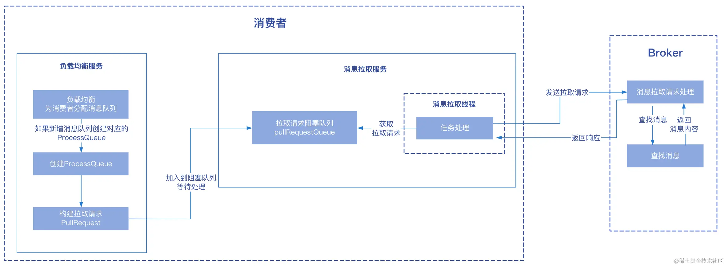 ProcessQueue关联了一个消息队列MessageQueue对象,消息队列对象中有其所在的Broker名称,根据名称再查找该Broker的详细信息; (2)根据第(1)步的查找结果,构建消息拉取请求,在请求中设置本次要拉取消息的Topic名称、消息队列ID等信息,然后向Broker发送请求; - 消费者处理拉取请求返回结果,上一步向Broker发送请求的时候可以同步发送也可以异步发送请求,对于异步发送请求当请求返回成功之后,会有一个回调函数,在回调函数中处理消息拉取结果。