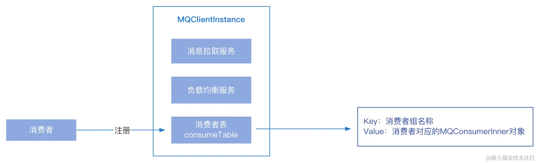 RebalanceService,是用来进行负载均衡,为每个消费者分配对应的消费队列; - 消费者列表(consumerTable):记录该实例上的所有消费者信息,key为消费者组名称,value为消费者对应的
