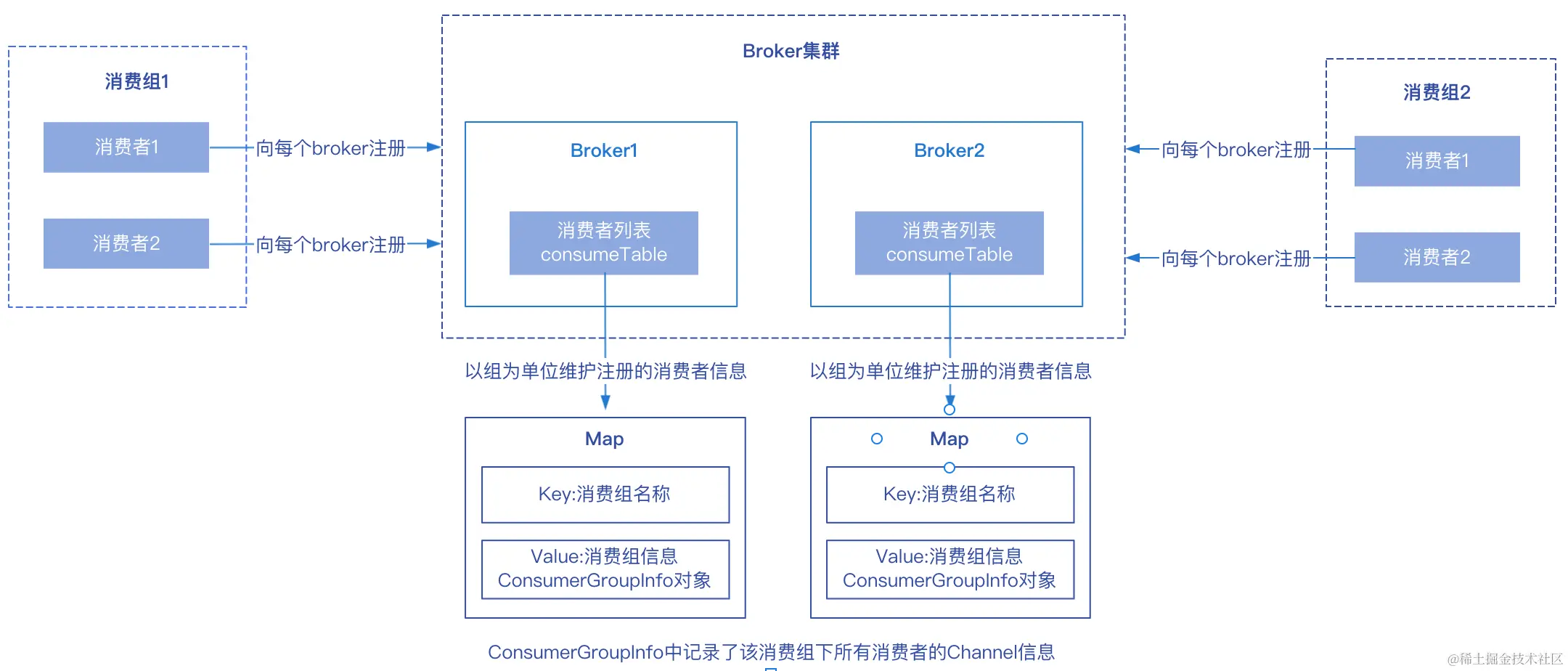 Broker收到消费者发送的心跳包之后,会从请求中解析相关信息,将该消费者注册到Broker维护的消费者列表consumerTable中,其中KEY为消费者组名称,Value为该消费组的详细信息(ConsumerGroupInfo对象),里面记录了该消费组下所有消费者的Channel信息。