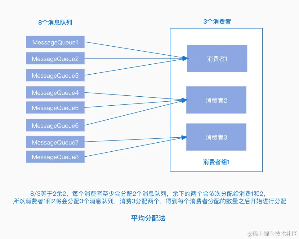 AllocateMessageQueueAveragely:平均分配策略,根据消息队列的数量和消费者的个数计算每个消费者分配的队列个数。
