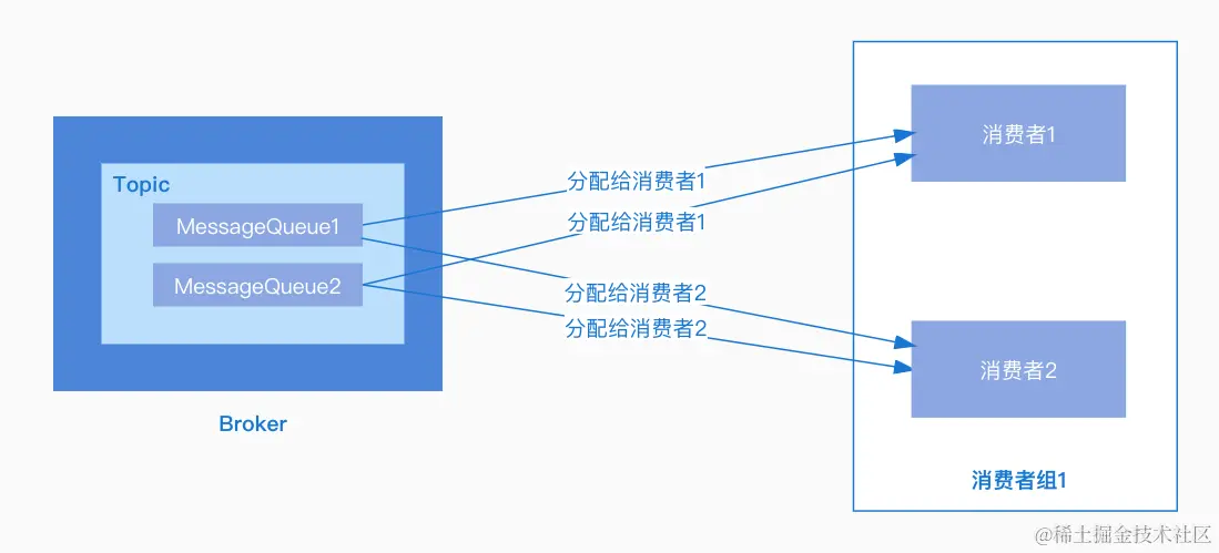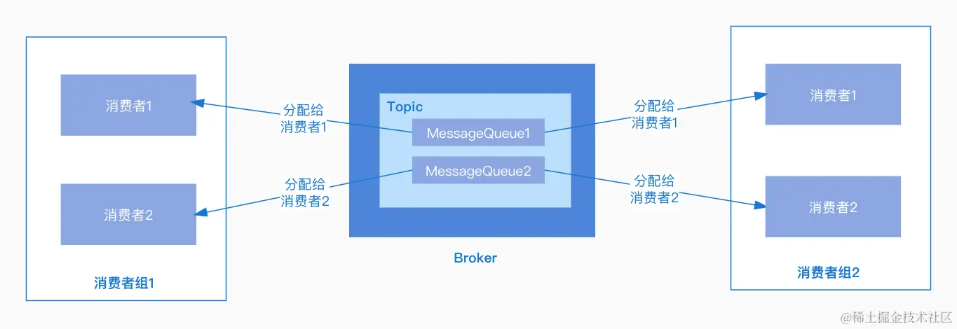 广播模式:同一个消息队列可以分配给组内的每个消费者,每条消息可以被组内的消费者进行消费。
