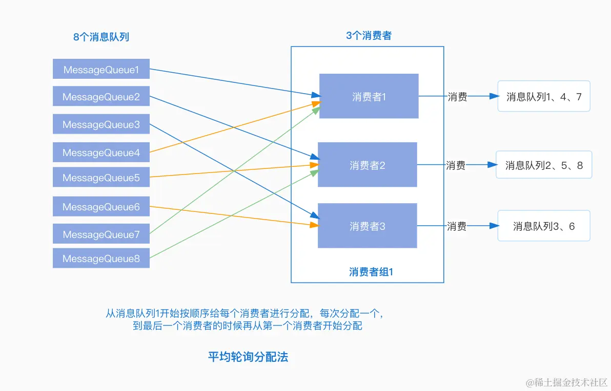 AllocateMessageQueueAveragelyByCircle:平均轮询分配策略,将消息队列逐个分发给每个消费者。