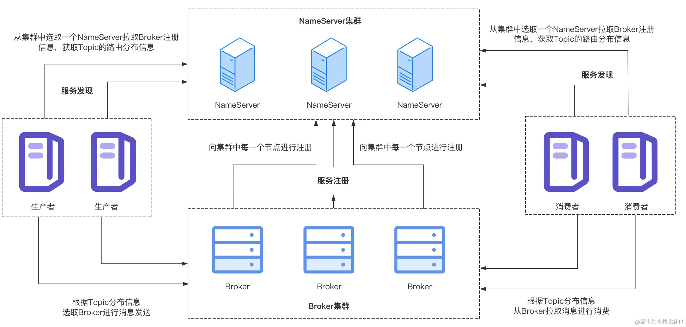 前面已经得知了当前消费者订阅的Topic信息,接下来需要知道这些Topic的分布情况,也就是分布在哪些Broker上,Topic的分布信息可以从NameServer中获取到,因为Broker会向NameServer进行注册,上报自己负责的Topic信息,所以这一步消费者向NameServer发送请求,从NameServer中拉取最新的Topic的路由信息缓存在本地。