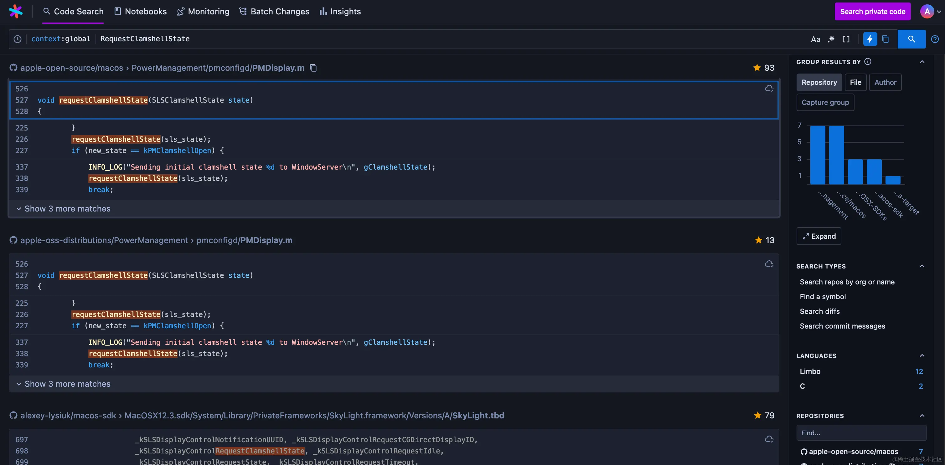 让我们看看互联网上是否有我们需要的东西。我通常在 SourceGraph 上搜索代码,因为它索引了一些带有 dyld dump 的大型 macOS 仓库。不过,查找 "RequestClamshellState "会得到更有趣的东西: