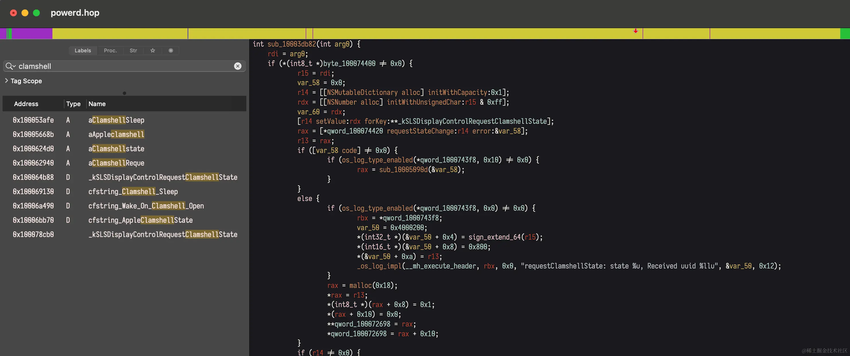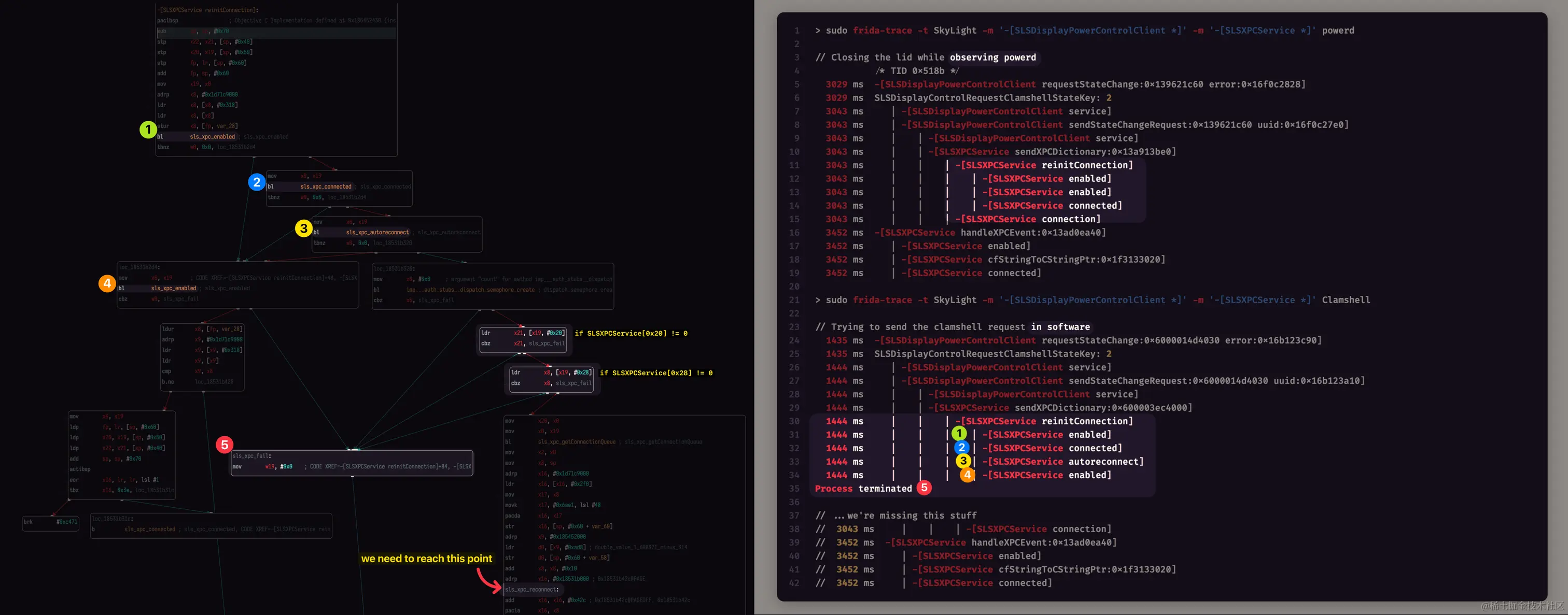 在 Hopper 中重命名了一些子过程后,我们可以在图中看到 powerd 和 Clamshell 通过 SLSXPCService.reinitConnection 所走的不同代码路径。