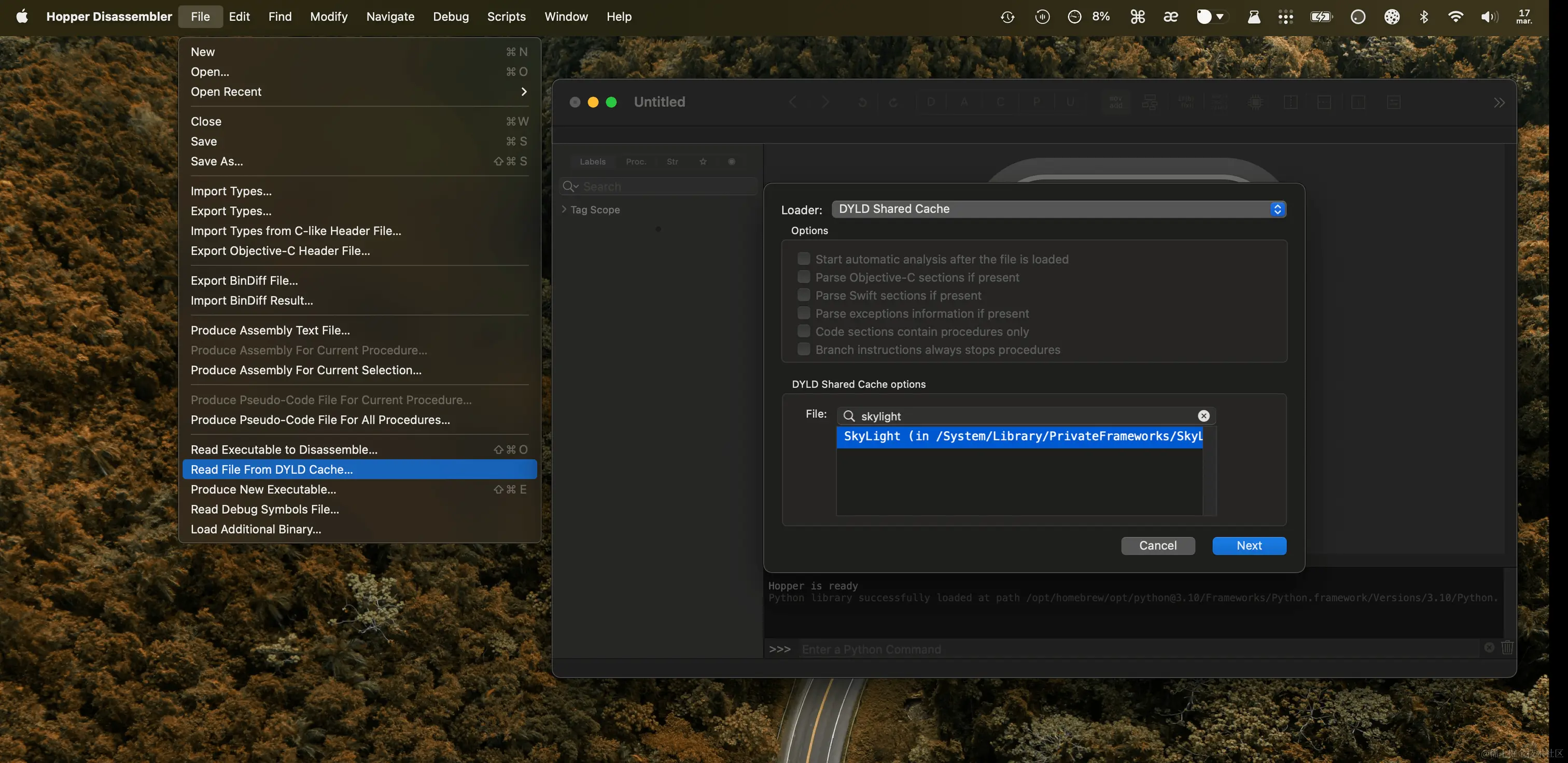 我更倾向于使用Hopper及其Read File From DYLD Cache功能,它可以从当前正在使用的缓存中提取框架: