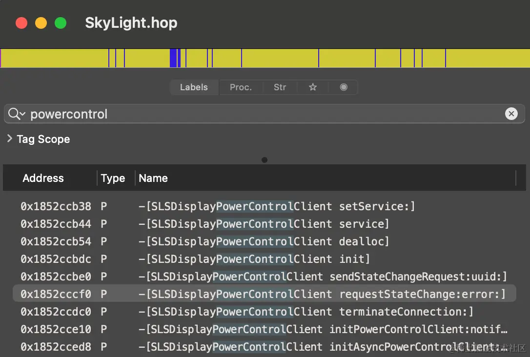 因此,它正在实例化一个 SLSDisplayPowerControlClient,然后调用其 requestStateChange 方法。"SLS "是与 SkyLight 相关的前缀 (可能代表 SkyLightServer),让我们看看我们的框架版本中是否有该代码。