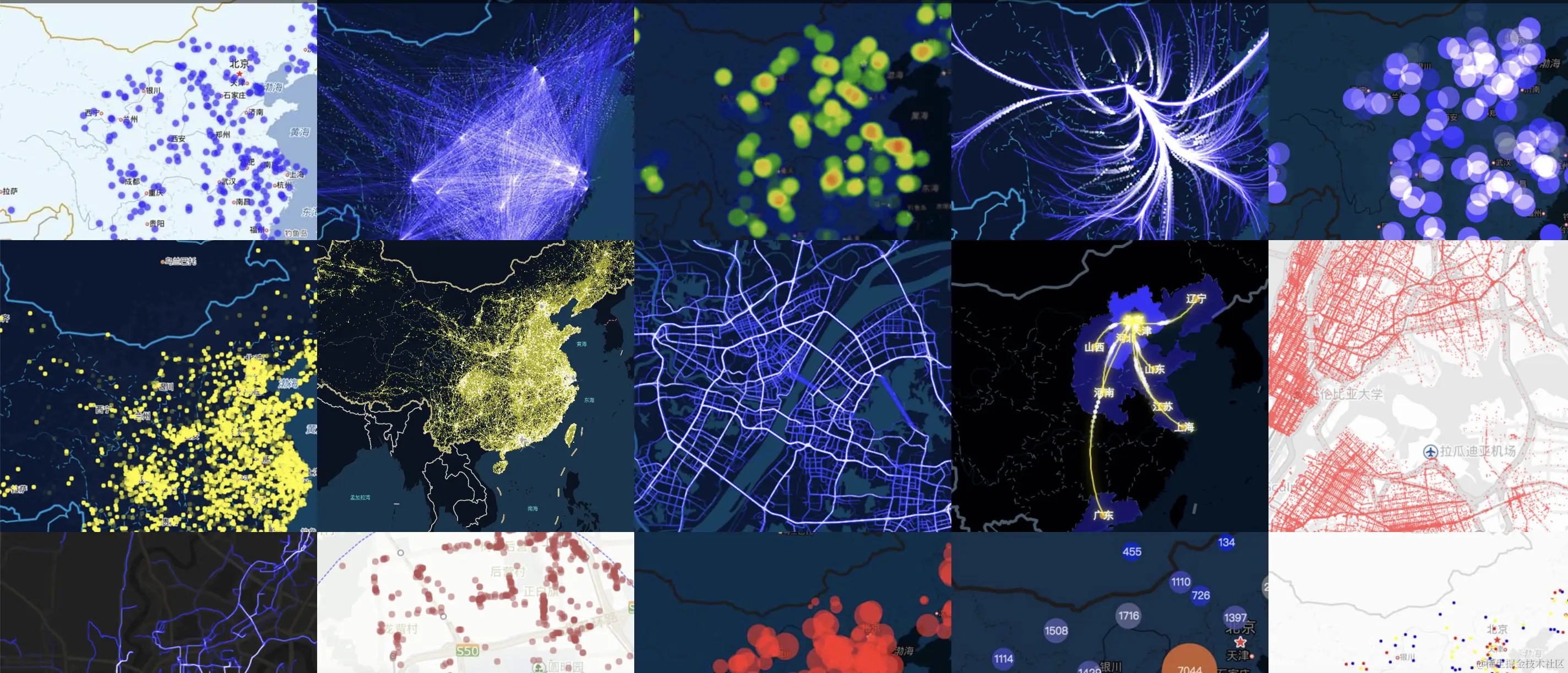 根据表格和图片,我们可以知道 Echarts 无疑是最佳选择,其次是L7、MapBox、inMap和MapV不分伯仲。此外 L7属于MIT,MapV 属于 BSD ,Echarts 和 inMap 属于 Apache,Mapbox GL 2.x 不再开源,地图数据将存在在其后端,采用申请 token 方式调用。