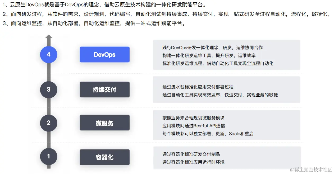云原生DevOps是充分利用云原生基础设施,基于微服务/无服务架构体系和开源标准,语言和框架无关,具备持续交付和智能自运维能力,从而做到比传统DevOps更高的服务质量、更低的开发运维成本,让研发专注于业务的快速迭代。默认常见有以下核心原则: