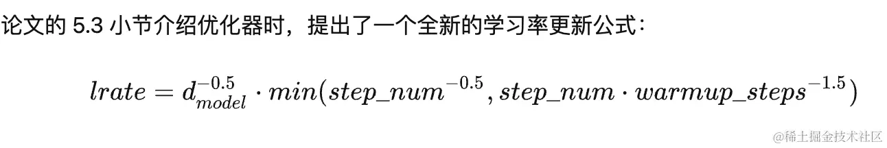 - 包含 block 堆叠方法的封装, Add & Norm 模块的实现,训练和评分模块的封装,动态更新学习率的实现(未看懂但是公式见下图),优化器的封装, 标签平滑(未看懂,一种正则方法),为看懂部分有测试用例可以辅助理解