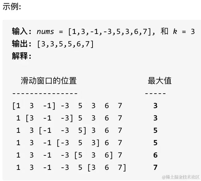 - 双端队列:我们使用一个双端队列来维护当前滑动窗口中的元素索引。这个队列的特点是它的前端始终包含当前窗口的最大值的索引。