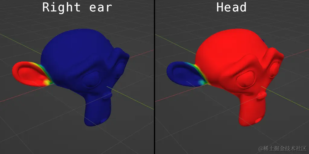 以下是模型的顶点如何粘附到不同的骨骼上(红色是很多胶水,蓝色是没有胶水):