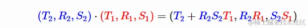 现在,将转换显式存储为平移、旋转和缩放是怎么回事,我们如何将它们相乘?好吧,只有一个公式!让我们将我们的转换表示为(T,R,S)– 平移向量、旋转运算符和比例因子。此转换对点的影响p是(T,R,S)⋅p=T+R⋅(S⋅p).让我们看看如果我们组合两个这样的转换会发生什么: