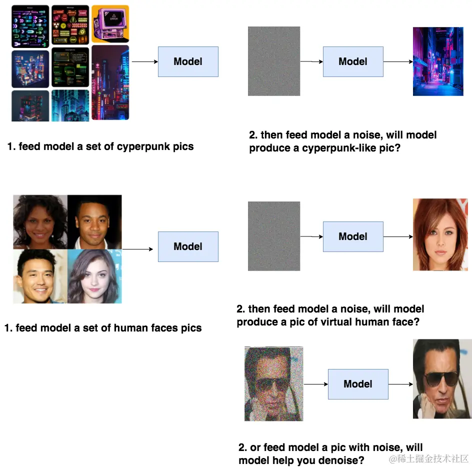我们先来看GAN想做一件什么事。如果你读过之前讲解扩散模型DDPM的这篇文章,你一定对下面这张图很熟悉。其实GAN和DDPM的目标是一致的:我想训练一个模型,在训练的时候,喂给它一堆图片,让它去学习这堆图片的分布。这样,在推理阶段,我喂给模型一个随机噪声,它就可以帮我“生成”一张和它吃进去的那些图片风格相似的图出来了。一句话总结:GAN和扩散模型,终极目标都是学习训练数据的分布。
