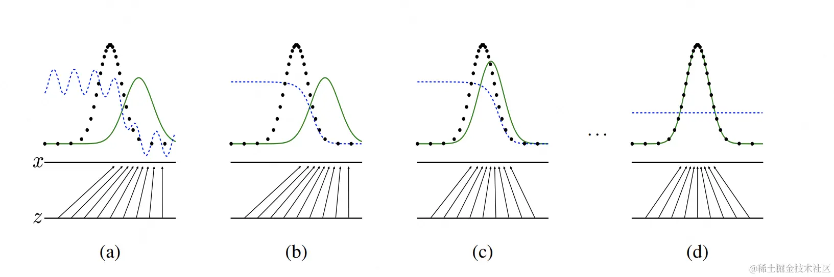 (a)表示在GAN训练的初始阶段,此时G和D都不强。因此绿色距离黑色相差甚远。蓝色的D输出也十分混乱,没有规律性。但总体来看,D还是可以区分出真实世界图片和G造假图片的(表现在靠近黑色的部分较高,靠近绿色的部分较低)。