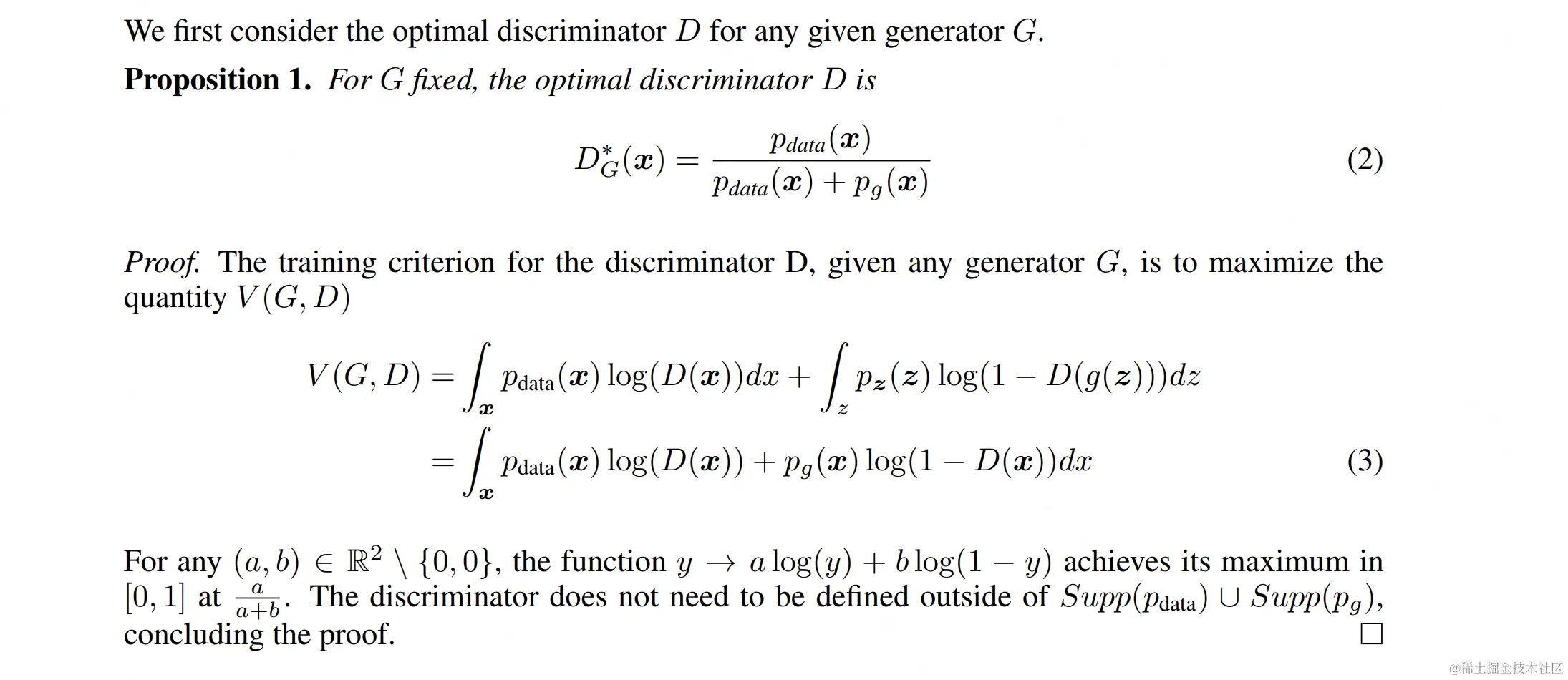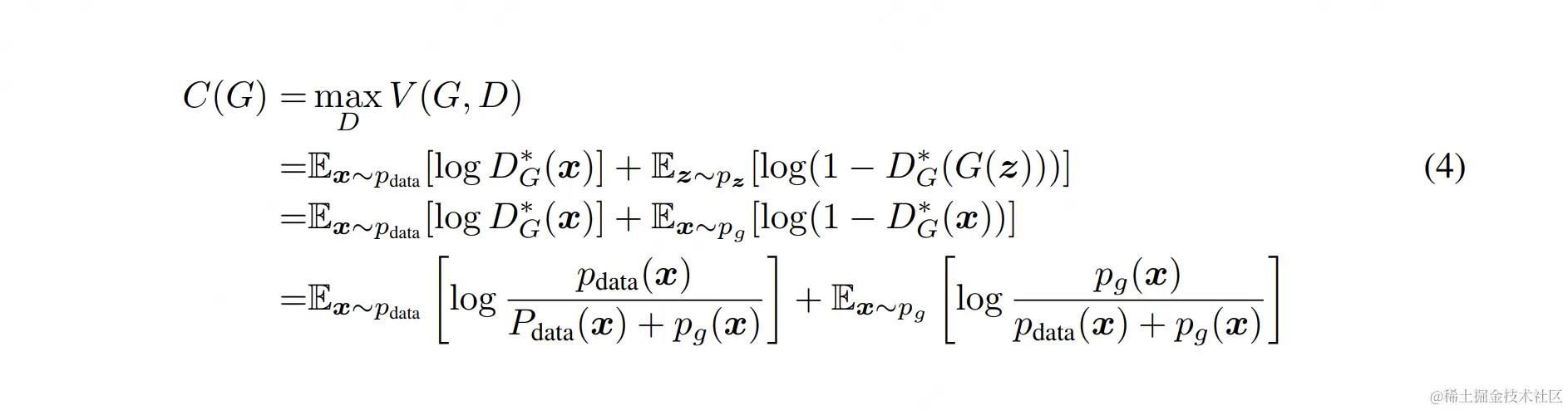 根据作者的理论推理,在固定G的情况下,D的全局最优解就是(2)中列出的样子。那么具体是怎么推导出(2)的呢?我们来看(3)