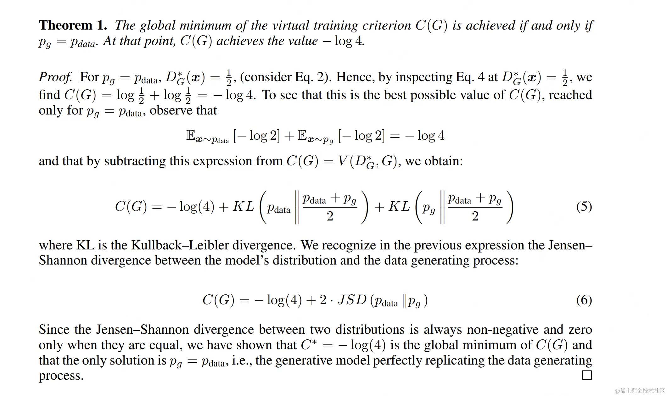 (5)中的两个KL散度又可以被写成(6)中Jensen-Shannon散度的形式(简称JSD),而JSD永远是非负的,且仅当时,它才为0。因此C(G)的最小值必然就是。