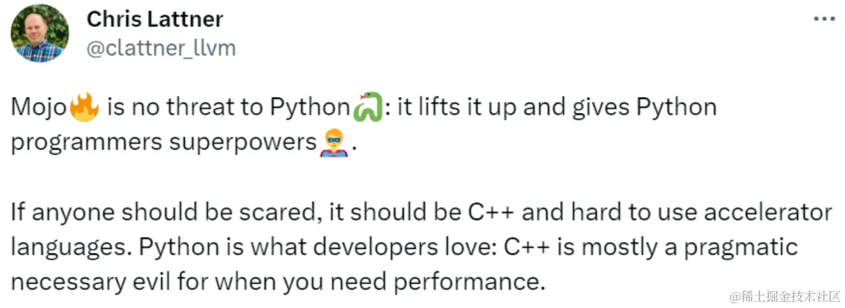Mojo并不会对Python造成威胁,相反,还会帮助Python开发者变得更强大。要担心的也不是Python,而是C++们。