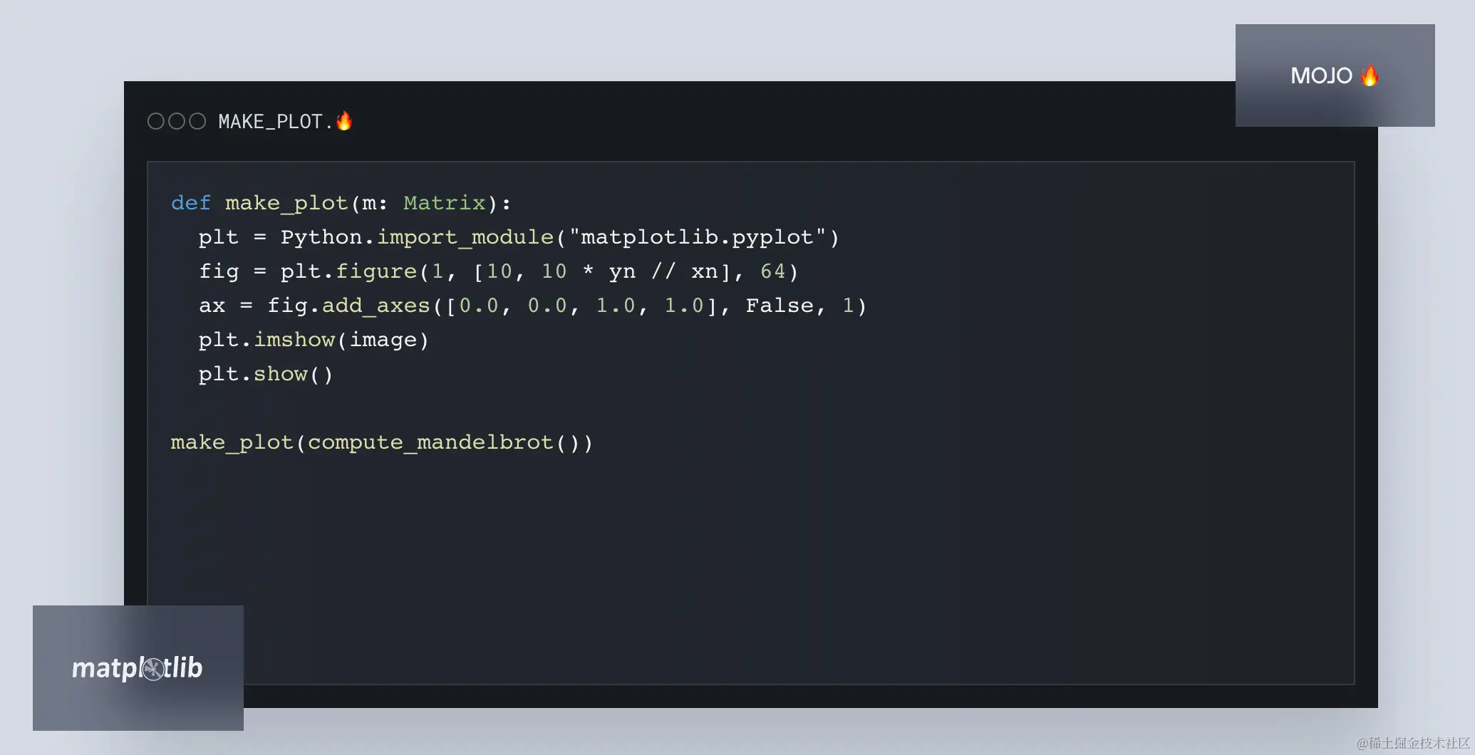 而Mojo则可以访问整个Python生态。比如使用Mojo,可以在代码中无缝地接入和混合像Numpy和Matplotlib等库。