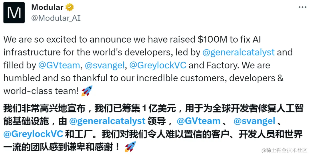 去年的时候,Modular AI曾获得过3000万美金的融资。而就在前些天,Modular又再次宣布成功融资 1 亿美金,这对于一个刚诞生不久的初创型公司而言可谓是成绩斐然。