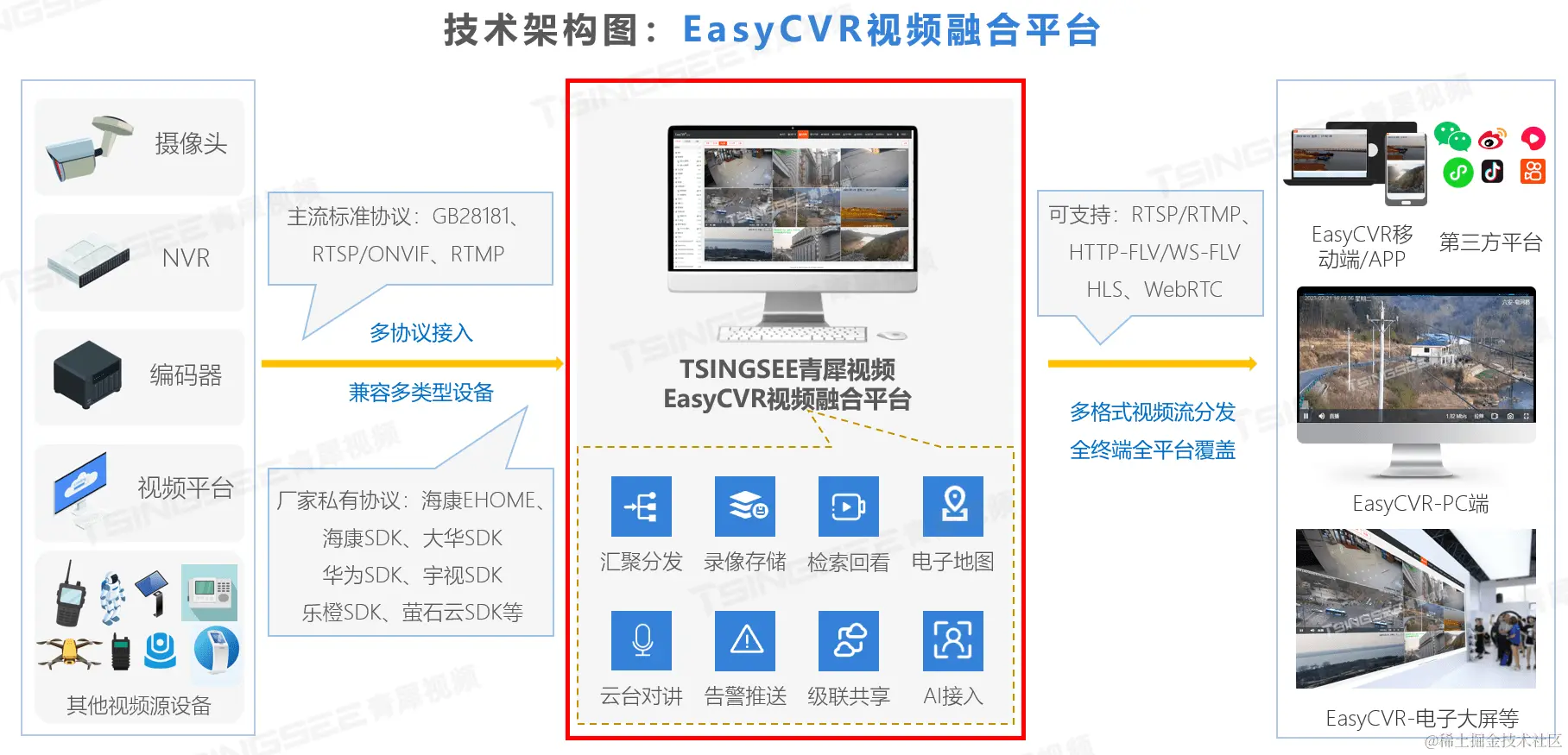 安防视频监控/视频集中存储/云存储/磁盘阵列EasyCVR平台可拓展性强、视频能力灵活、部署轻快,可支持的主流标准协议有国标GB28181、RTSP/Onvif、RTMP等,以及支持厂家私有协议与SDK接入,包括海康Ehome、海大宇等设备的SDK等。平台既具备传统安防视频监控的能力,也具备接入AI智能分析的能力,可拓展性强、视频能力灵活,能对外分发RTMP、RTSP、HTTP-FLV、WebSocket-FLV、HLS、WebRTC等视频流。