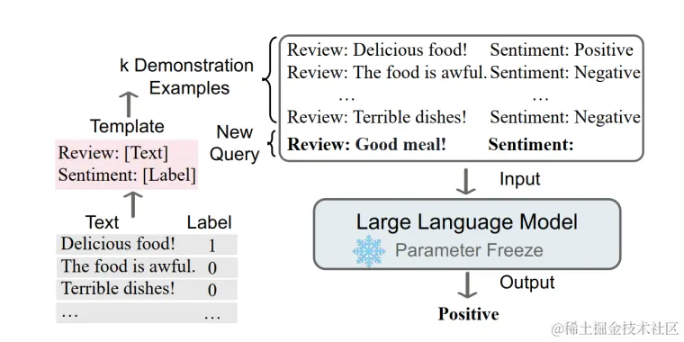 上下文学习的核心思想是通过类比来学习。对于一个情感分类任务来说,首先从已存在的情感分析样本库中抽取出部分演示示例,包含一些正向或负向的情感文本及对应标签;然后将其演示示例与待分析的情感文本进行拼接,送入到大型语言模型中;最终通过对演示示例的学习类比得出文本的情感极性。