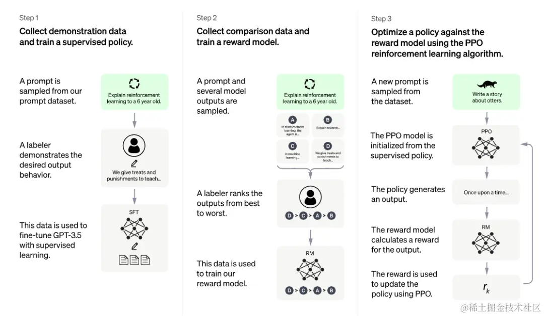 ChatGPT训练的整体流程主要分为3个阶段,预训练与提示学习阶段,结果评价与奖励建模阶段以及强化学习自我进化阶段;3个阶段分工明确,实现了模型从模仿期、管教期、自主期的阶段转变。