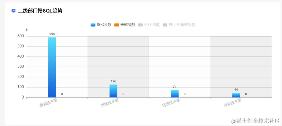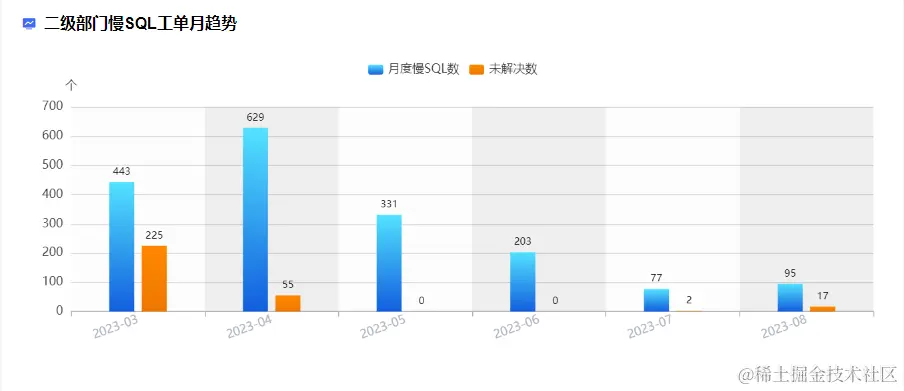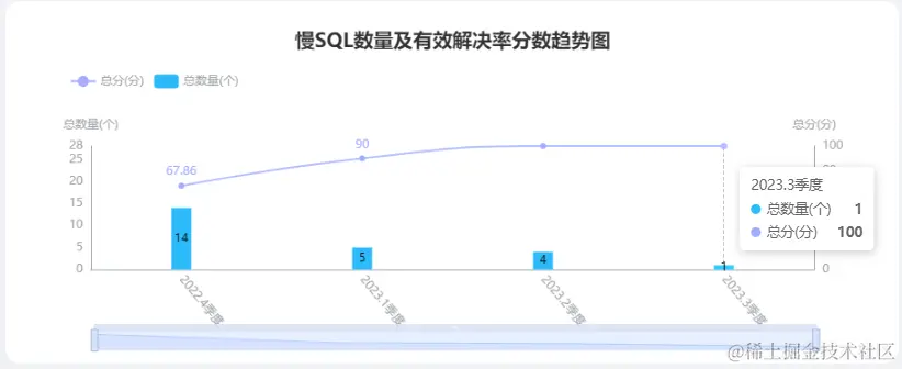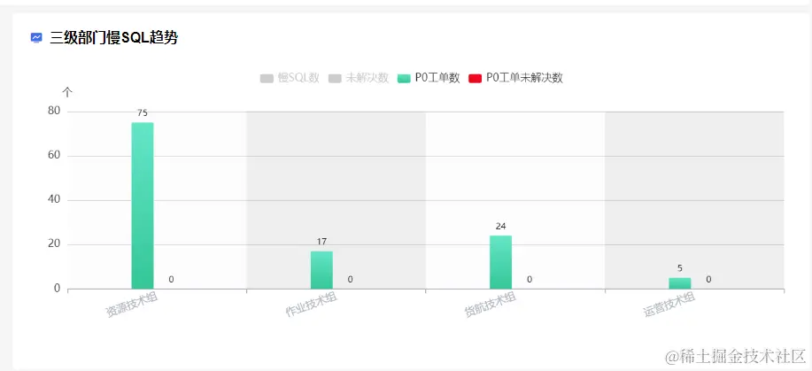 根据每个阶段关注指标数据,制作慢SQL解决趋势图表,实现团队内可清晰查看,每个实例下的慢SQL明细,支持多个维度筛选;同时按照时间维度支持查看解决趋势了,现存数量等。