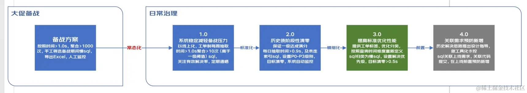 改变慢SQL治理习惯,由原大促备战期间治理,落地按照日维度产生的慢SQL每天跟进,关注双周维度治理的有效率。