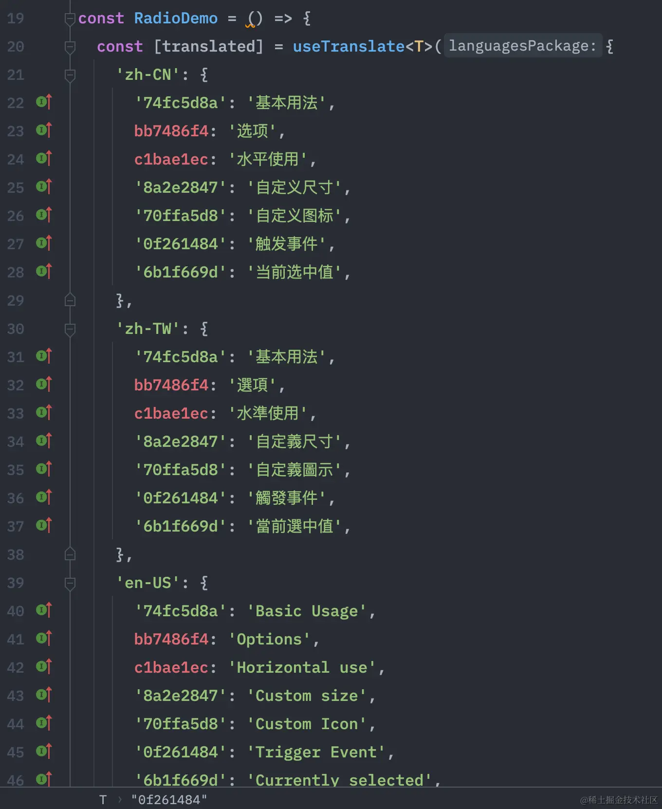 例如 Radio 组件中,我们将用到的文案通过 node scripts/extract-language.js 提取出 key-value 的结构,这一结构的实施依赖我们提供的 useTranslate hook。这样便将 Demo 翻译最繁琐的一步给简化了。