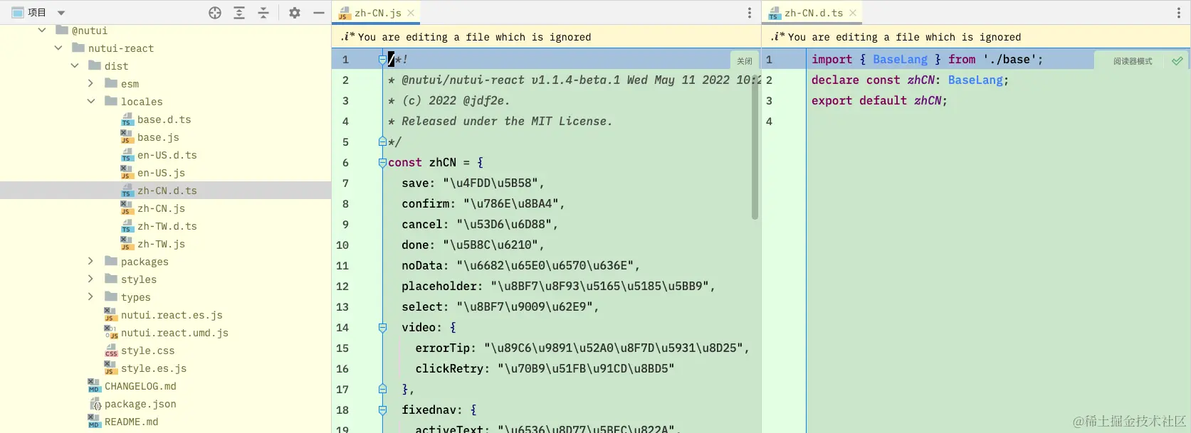 对于 nutui-react 的用户而言,ConfigProvider 组件是一大重点,其次便是 nutui-react 包中提供的多语言文件,文件路径为 @nutui/nutui-react/dist/locales 下。在此目录下除多语言文件外,还提供了对应的 typescript 类型文件。