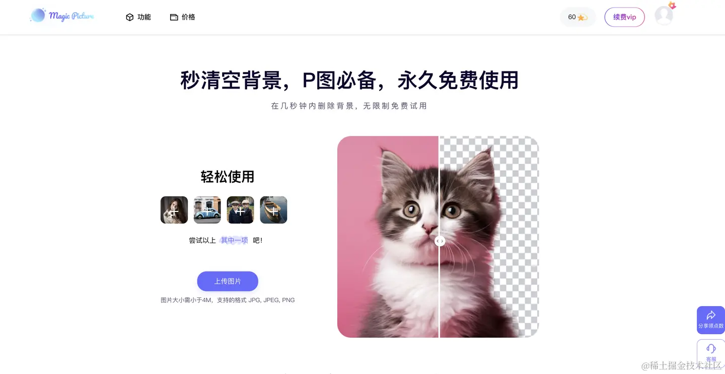 使用方式也很简单,只需要点击上传图片按钮,把想要的图片上传上去,AI即可自动识别并去除背景图