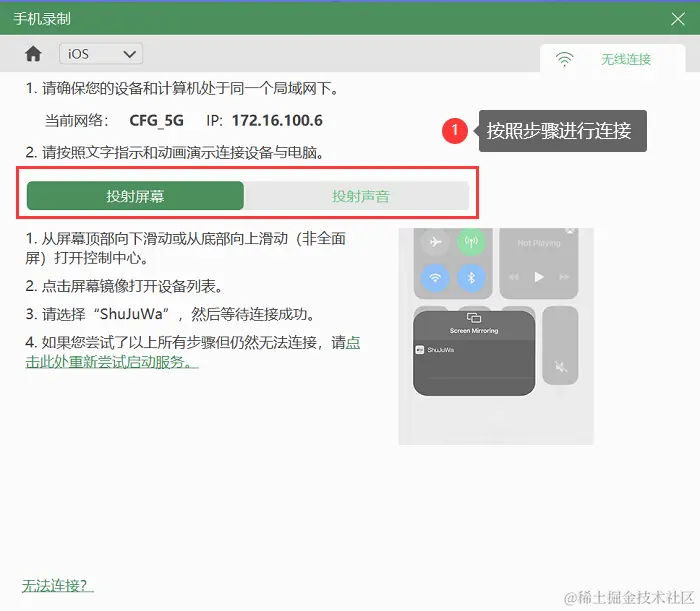 第2步:进入后选择iOS录制,通过无线连接方式把ipad投屏到电脑上,按照官方提示,一步步进行操作。