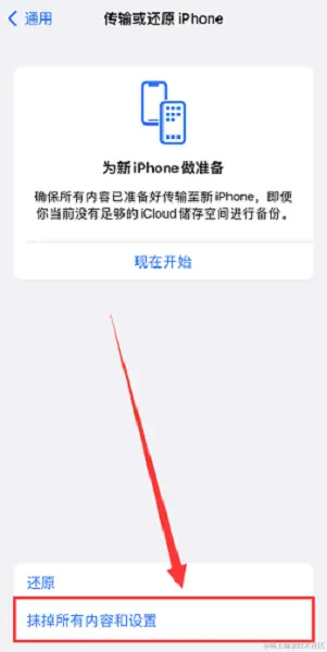 步骤2:在新弹出页面点击【抹掉所有内容和设置】按钮,等待手机抹除所有设置和数据。