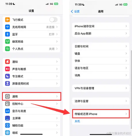 步骤1:首先对iPhone设备进行擦除,打开手机【设置】——【通用】——【传输或还原iPhone】选项。