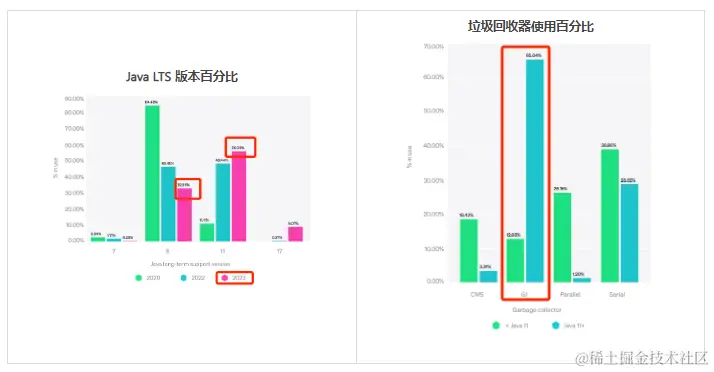 - 垃圾收集器使用情况来看,JDK11版本及以上 G1使用率最高,占比高达65%