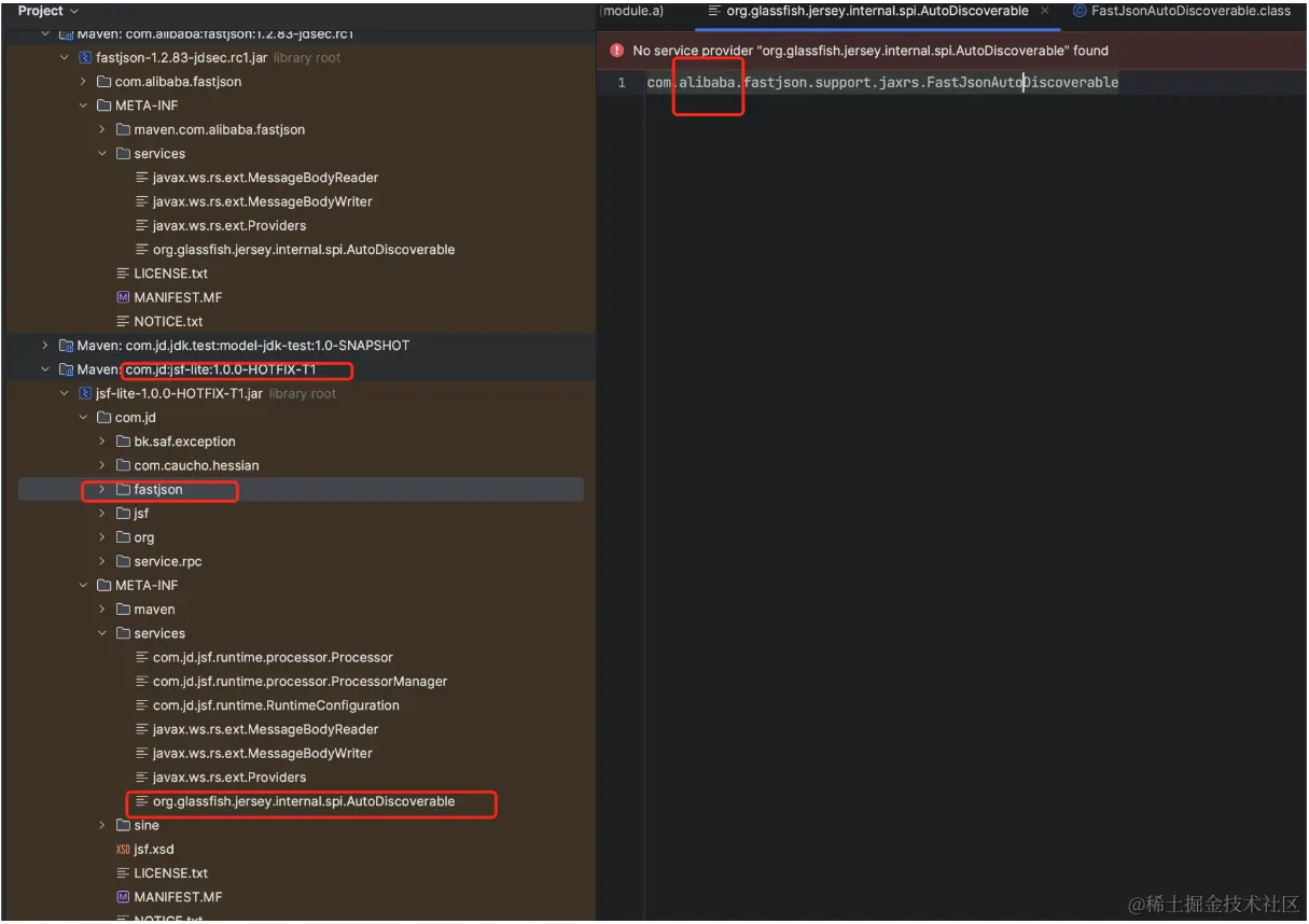 经过一系列定位研究,发现jsf-lite包中,/META-INF/services下的文件org.glassfish.jersey.internal.spi.AutoDiscoverable里面写的类是com.alibaba.fastjson.support.jaxrs.FastJsonAutoDiscoverable,此类并未在当前jsf.lite包中定义,属于com.alibaba.fastjson包的。