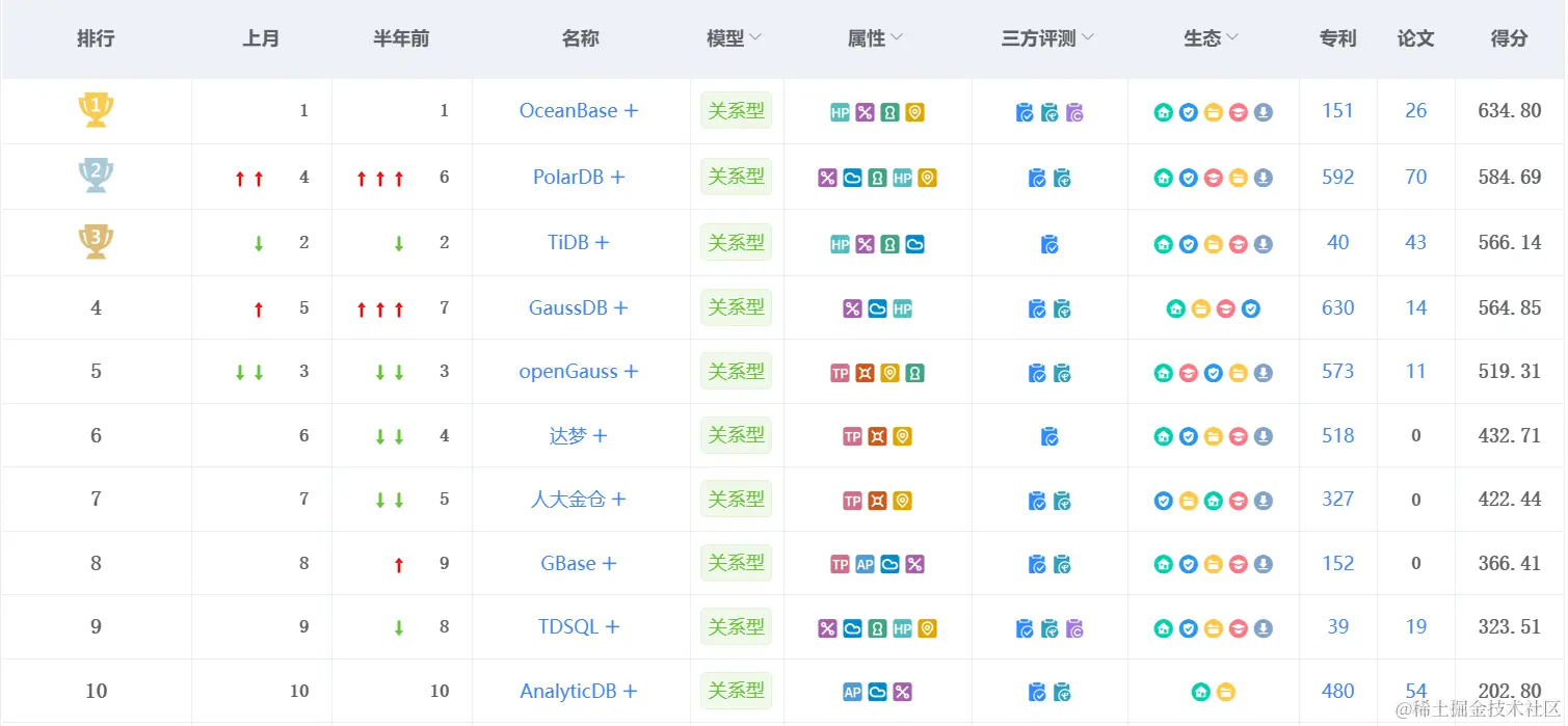 OceanBase 仍以王者之势雄踞墨天轮榜首,本月得分634.8分,新增4篇论文。 其作为一款金融级分布式数据库,全国已有1/4的头部金融客户将其作为核心系统升级首选。上月,OceanBase 中标中原银行2023年信息技术应用创新项目,并开源生态工具 ODC,极大地稳固了其在榜单上的优势地位。
