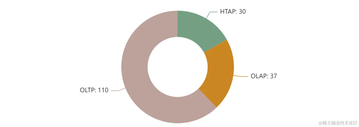 在175个关系型数据库中,OLTP 数据库110个,占比62.8%。HTAP 和 OLAP 分别有30个和37个,当前业内仍然以在线事物处理 OLTP 关系型数据库为主,未来混合负载数据库 HTAP 会成为复杂应用的首选,能够同时支持在线事务处理和复杂数据分析。