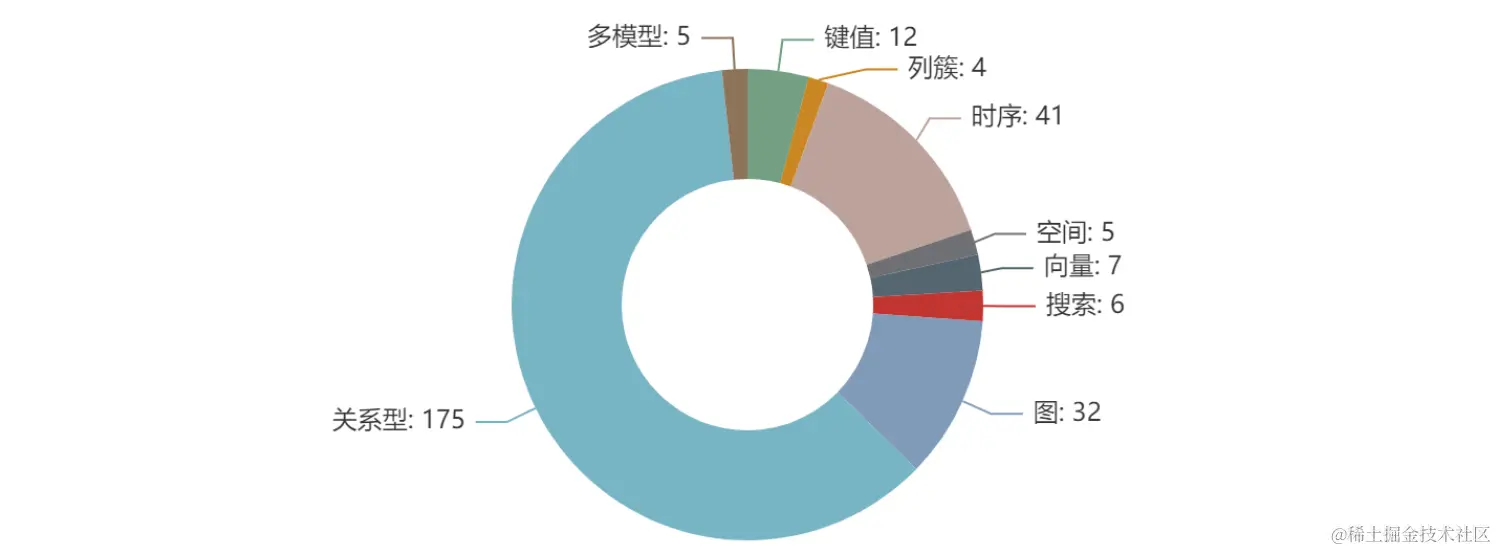 本月排行榜共有287个数据库参与排名,参与排名的数据库中,关系型数据库共有175个,占比60.9%,其次则是图数据库占比11.1%。各模型具体数量如下图所示:
