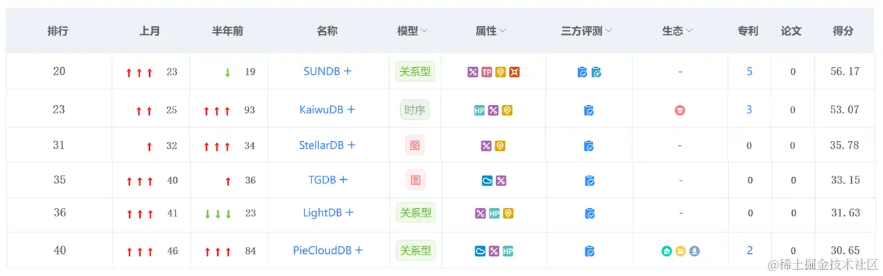 本月排行榜前40名中,拓数派 PieCloudDB,TGDB 力争上游,进入这一赛段。此外,还有一些数据库产品深耕细作,表现亮眼。限于篇幅,小编仅在此筛选了部分数据库的得分和排名,一起来看看它们的最新动态。