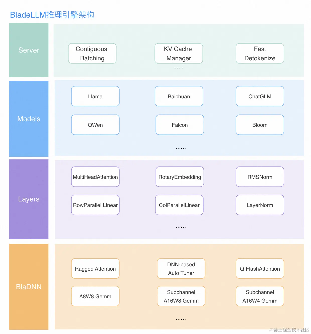 以下是BladeLLM推理引擎的技术架构图,包含了很多核心组件,本文主要介绍其中的RaggedAttention和DNN-based AutoTuner.