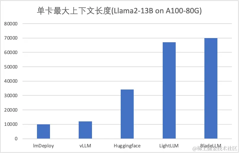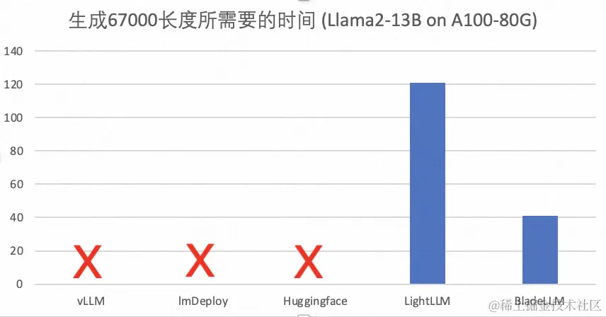 - LightLLM最大生成长度(67K)和BladeLLM(70K)接近,但是所需要的时间是BladeLLM的3倍
