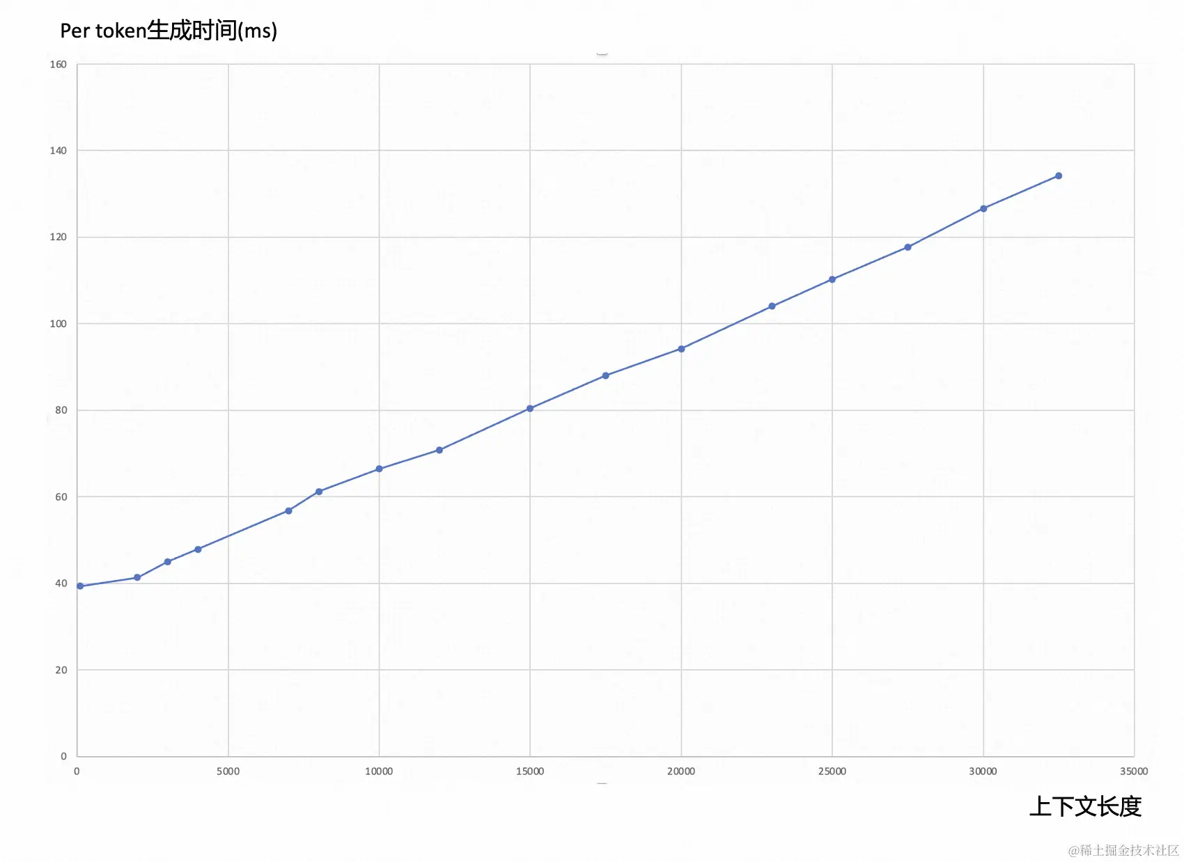 以HuggingFace Llama2-13B模型为例,随着上下文长度的增加,生成一个token的时间显著增加,具体增长趋势如下图所示。上下文长度34K时HuggingFace开源模型生成一个token的时间是上下文长度1K时的3.5倍.