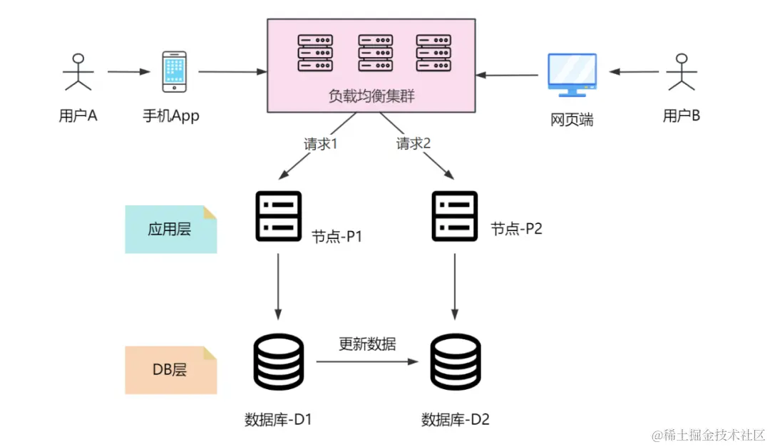 可用性要求 P1 和 P2 都可以实时响应,因此在 D2 刚更新完还未同步给 D1 时,两个 DB 的数据是不一致的,也就违背了 P1 和 P2 上的数据一致性。
