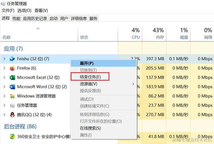 2.在 【进程】 中,找到并结束占用资源较多的进程;