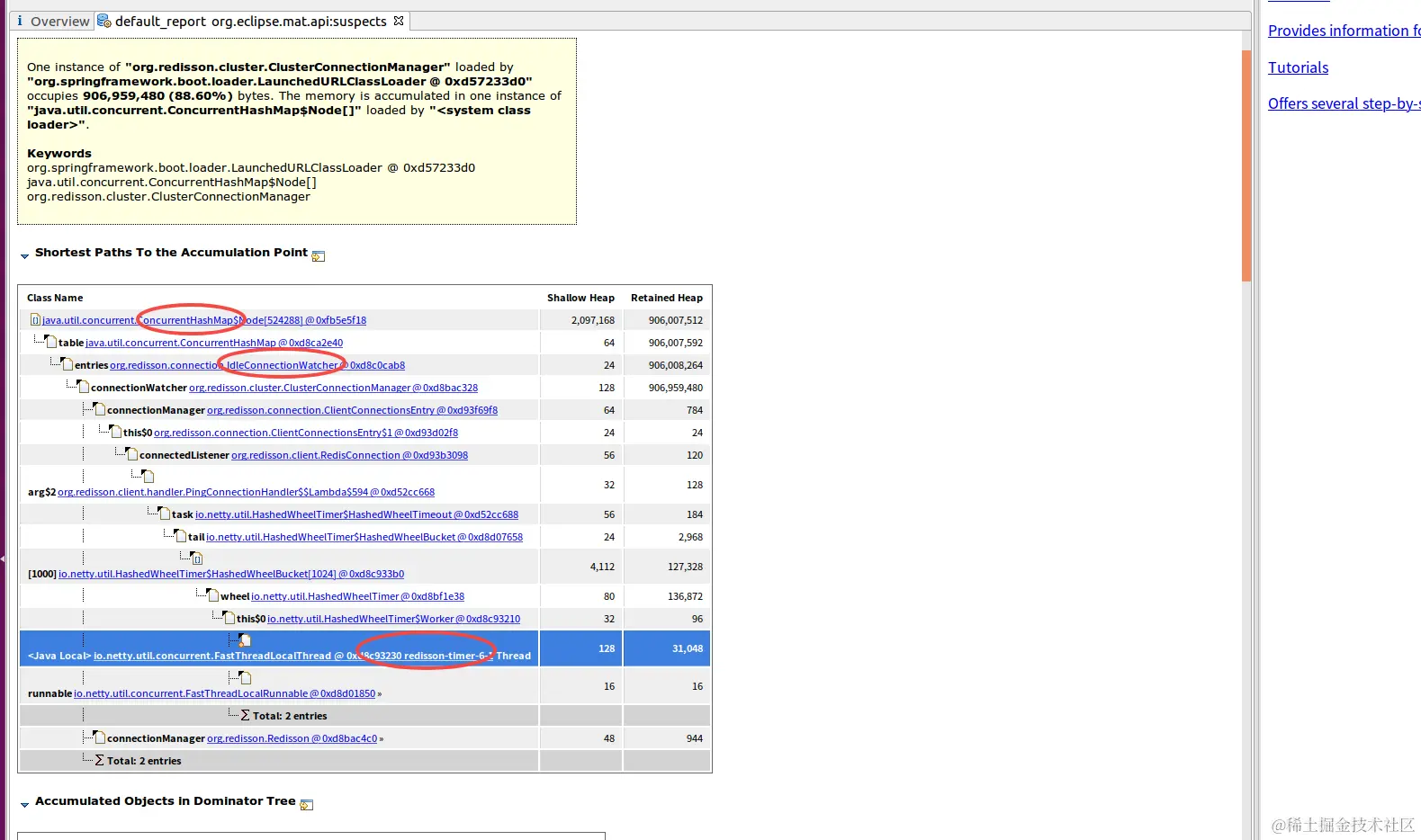 分析发现Redission框架里的 IdleConnectionWatcher 占用了大量内存,主要集中在ConcurrentHashMap里,没有释放