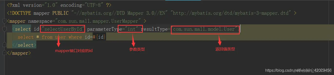 <select id="selectUserById" parameterType="int" resultType="com.sun.mall.model.User">